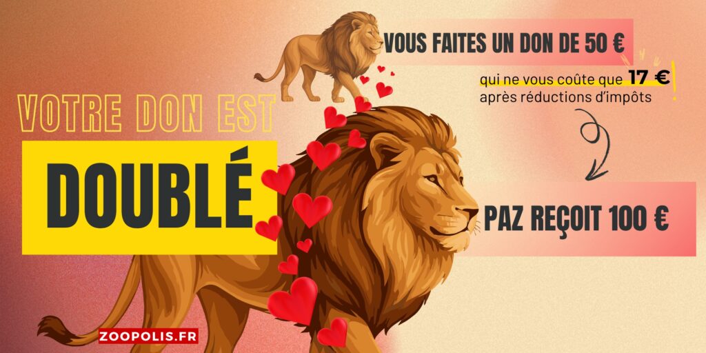 Du 3 au 26 octobre 2025, pour chaque euro donné, PAZ reçoit deux euros grâce à de grandes donatrices et grands donateurs qui doublent les dons. Faites-en profiter les animaux !