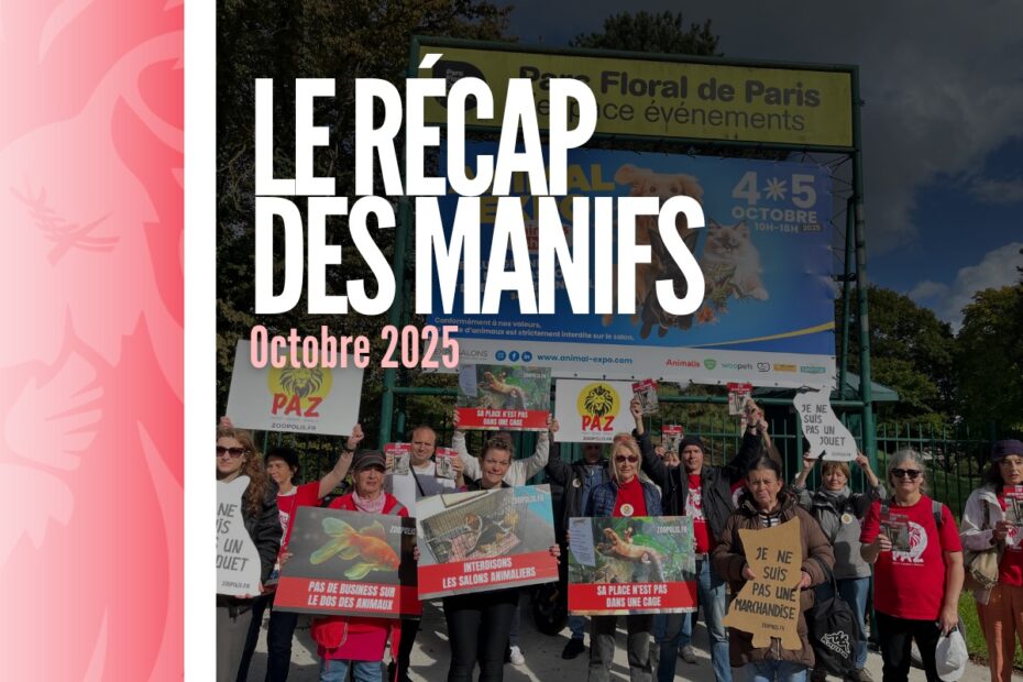 En ce mois d’octobre, plusieurs manifestations ont eu lieu, devant des salons animaliers : à Paris, à Auxerre (Ici, Ici), à Toulouse (Toulousefm, Actu.fr) et à Saint-Étienne (Le Progrès, Ici). Ces actions ont permis de sensibiliser le public, mais elles avaient avant tout pour but de demander aux propriétaires des salles ou aux mairies de ne plus accueillir de salons dans les lieux qui leur appartiennent. D’ailleurs, grâce à la mobilisation de PAZ, la Ville de Toulouse a modifié le contrat du lieu où était accueilli le salon animalier : à partir de 2027, il n’aura plus l’autorisation d’en accueillir (Le Journal Toulousain, La Dépêche, L’Opinion Indépendante, France 3) !
