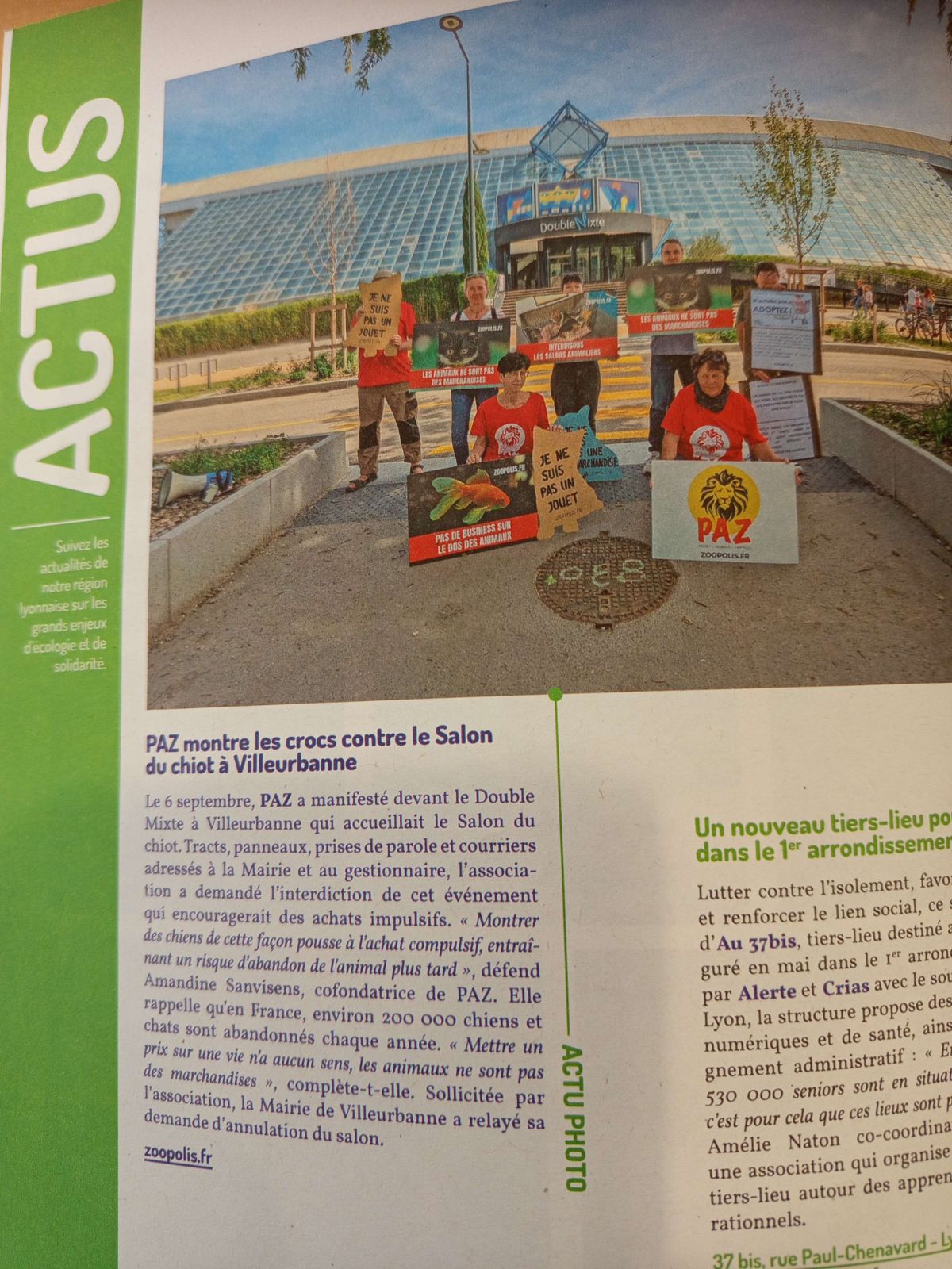 02/09/2025 – Lyon Capitale / Villeurbanne : l’association PAZ se mobilise contre le Salon du chiot