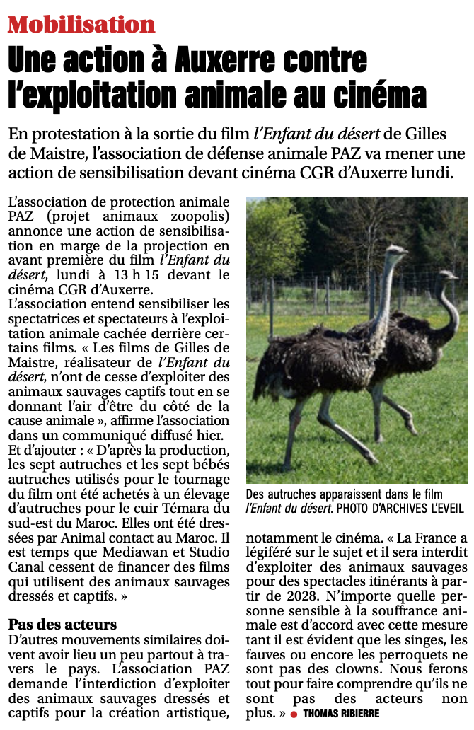 26/03/2026 – L’Union / Animaux exploités ? Une association s’oppose à la sortie d’un film au cinéma